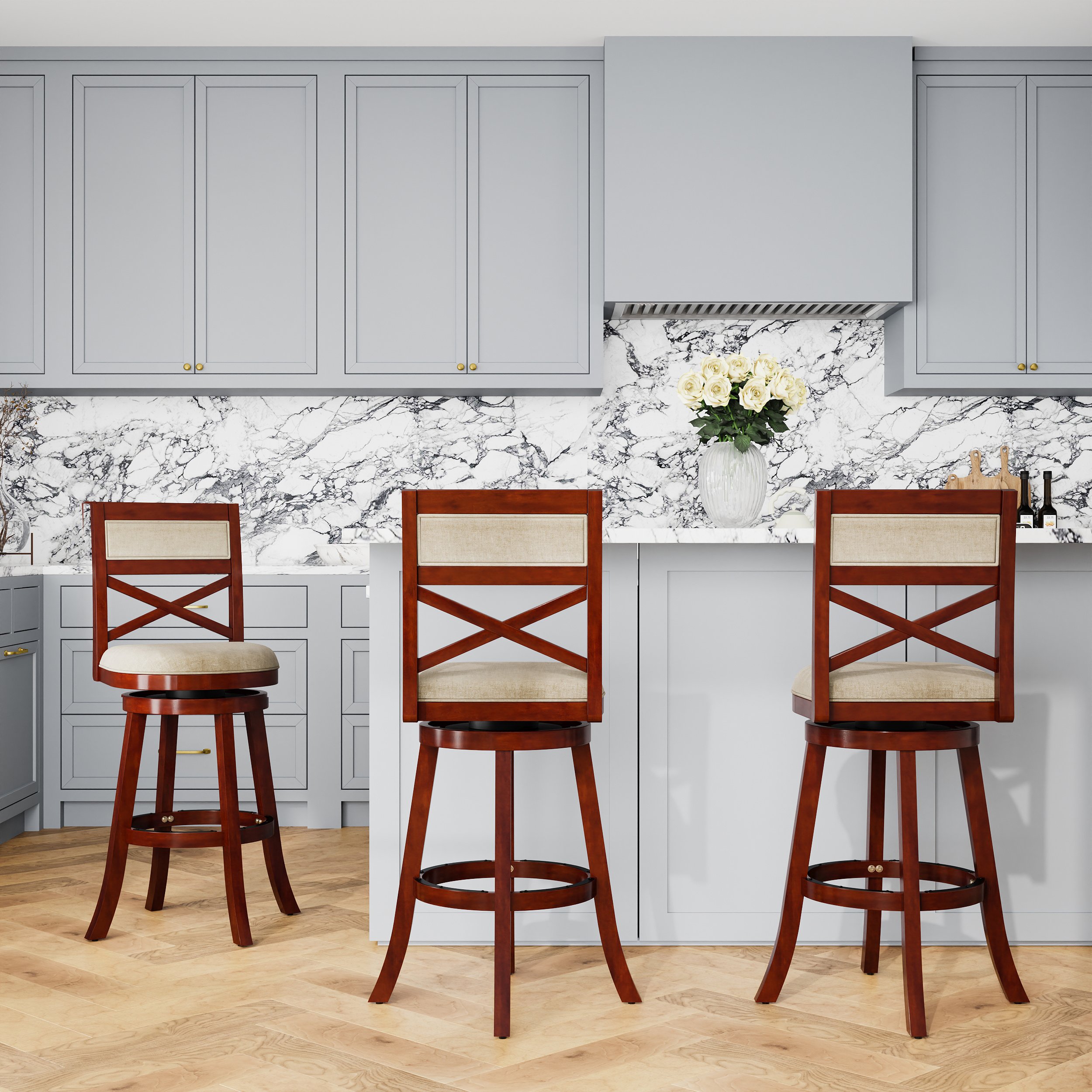 Home > 30" Bar Height X-Back Swivel Stool, Cherry Finish, Beige Fabric Seat