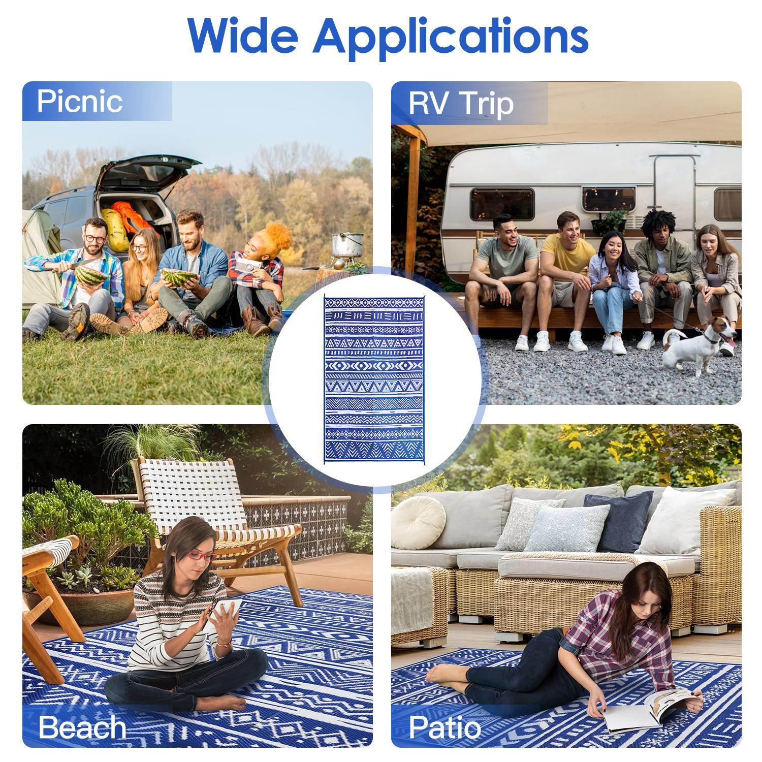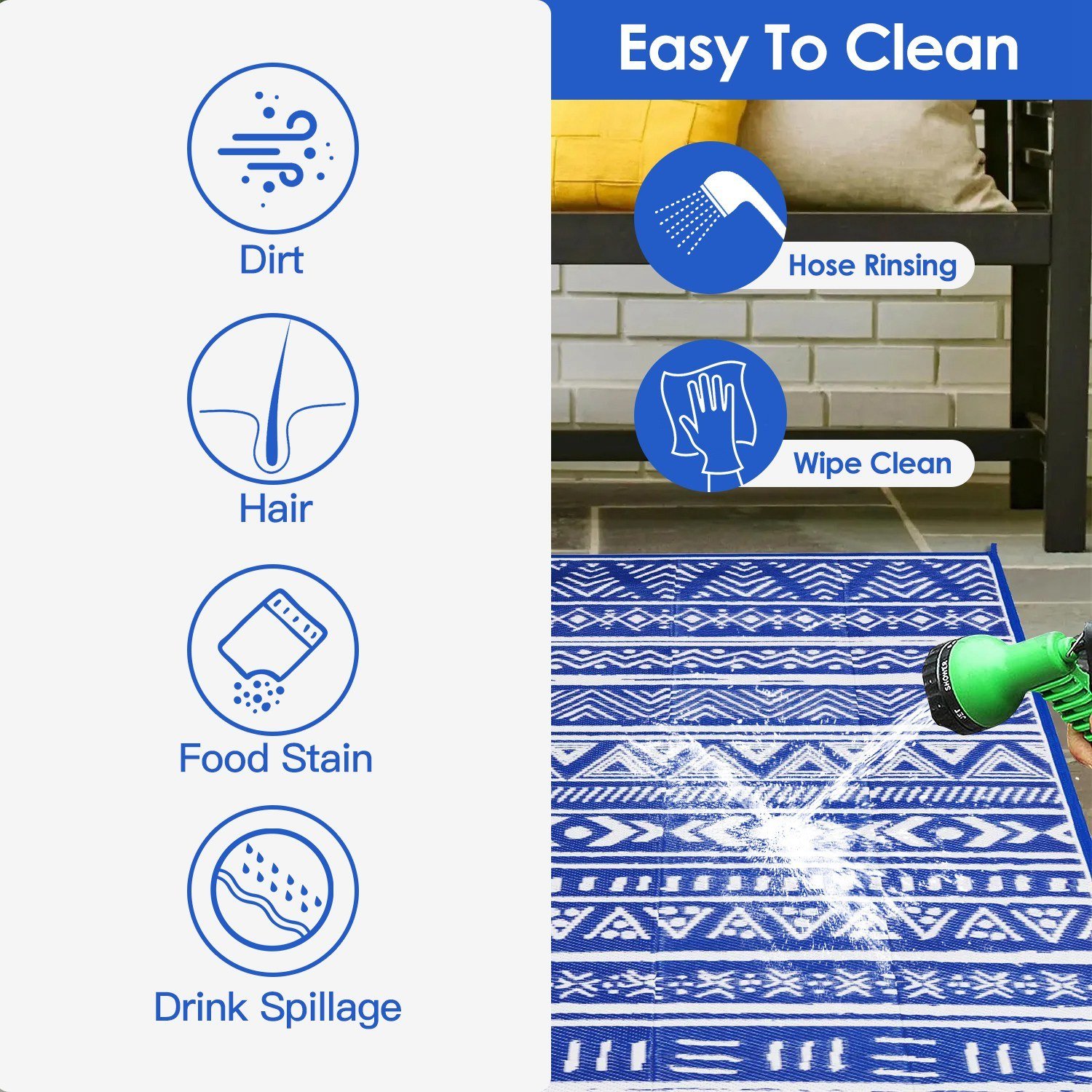 *Easy to Clean*:Made of waterproof,stain-resistant,anti-fading and quick dry PP material,you can easily rinse or wipe the dirt,hair,spill,food and drink stains on the mat after use. A reusable outdoor rug provides you and your family with a clean and wide space in high-traffic areas.