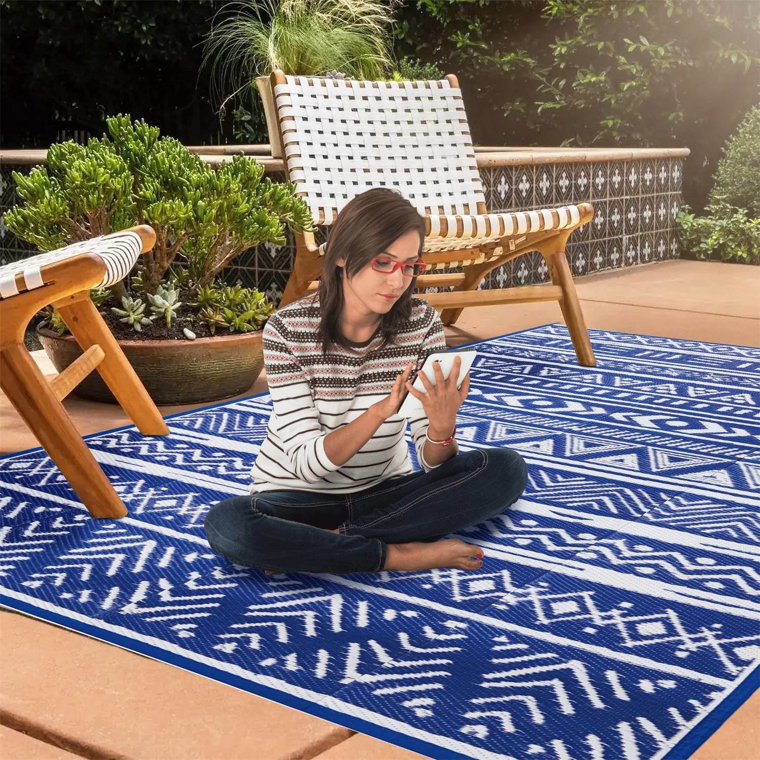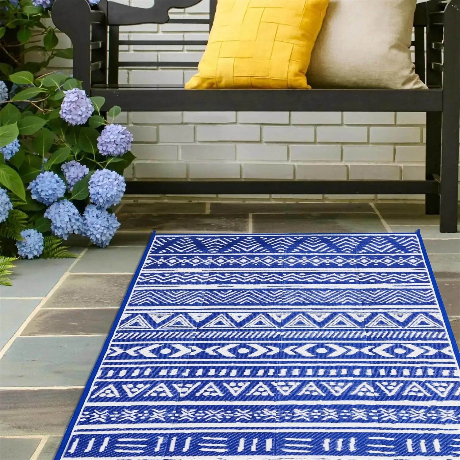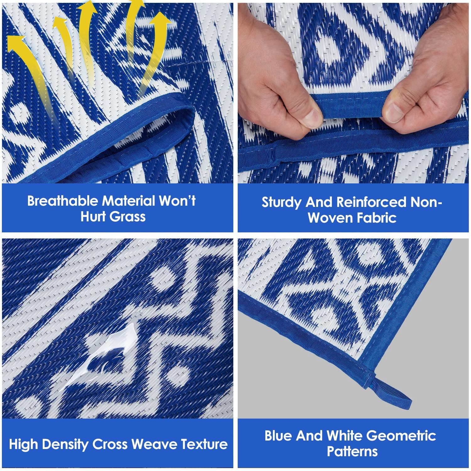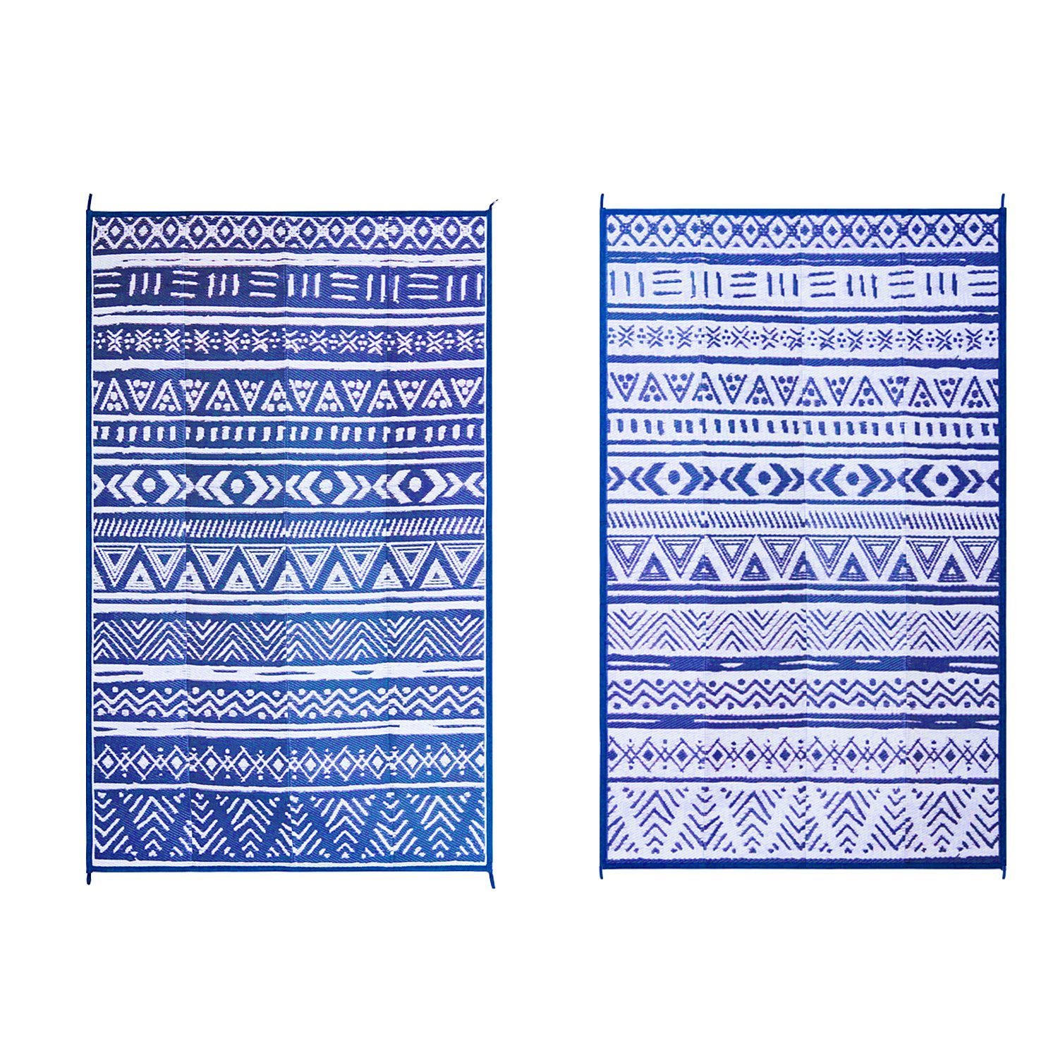 *Reversible Rug*:This 4.98x8FT mat is designed with blue and white geometric patterns on both sides,you can flip over to get a new one if one side is messy. Bohemian style makes it also a stylish decoration on floor,a large,affordable and practical outdoor or indoor rug.