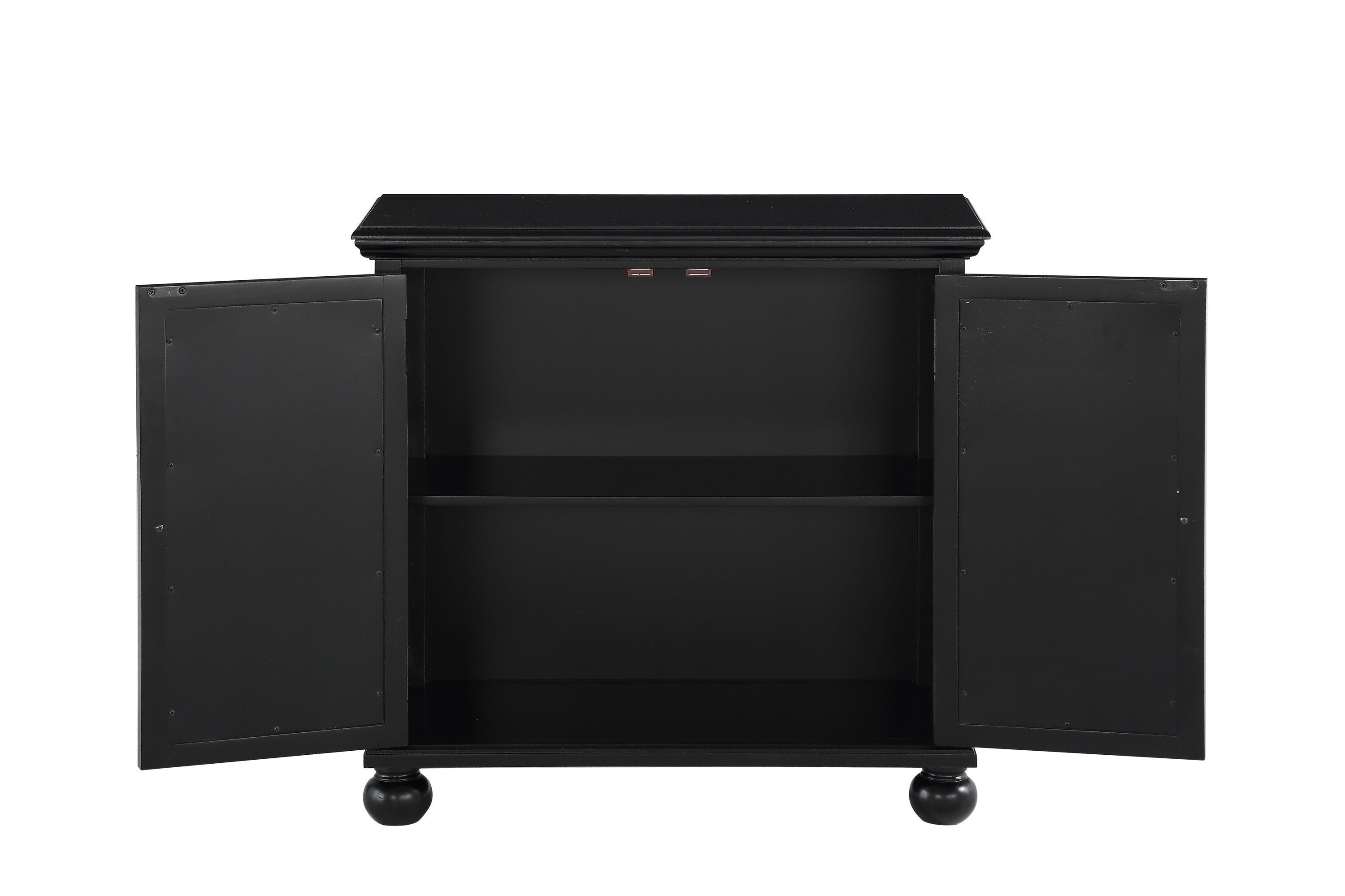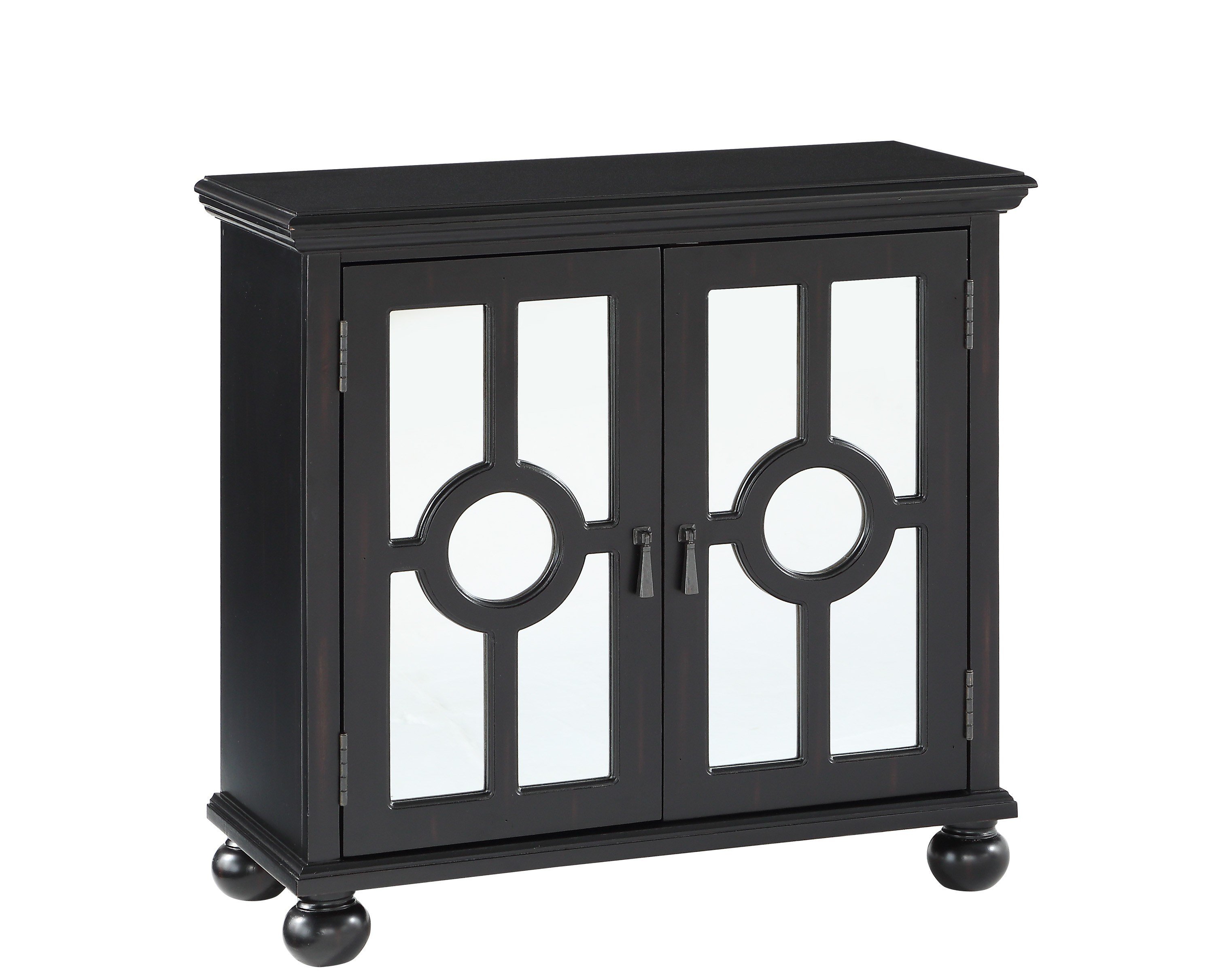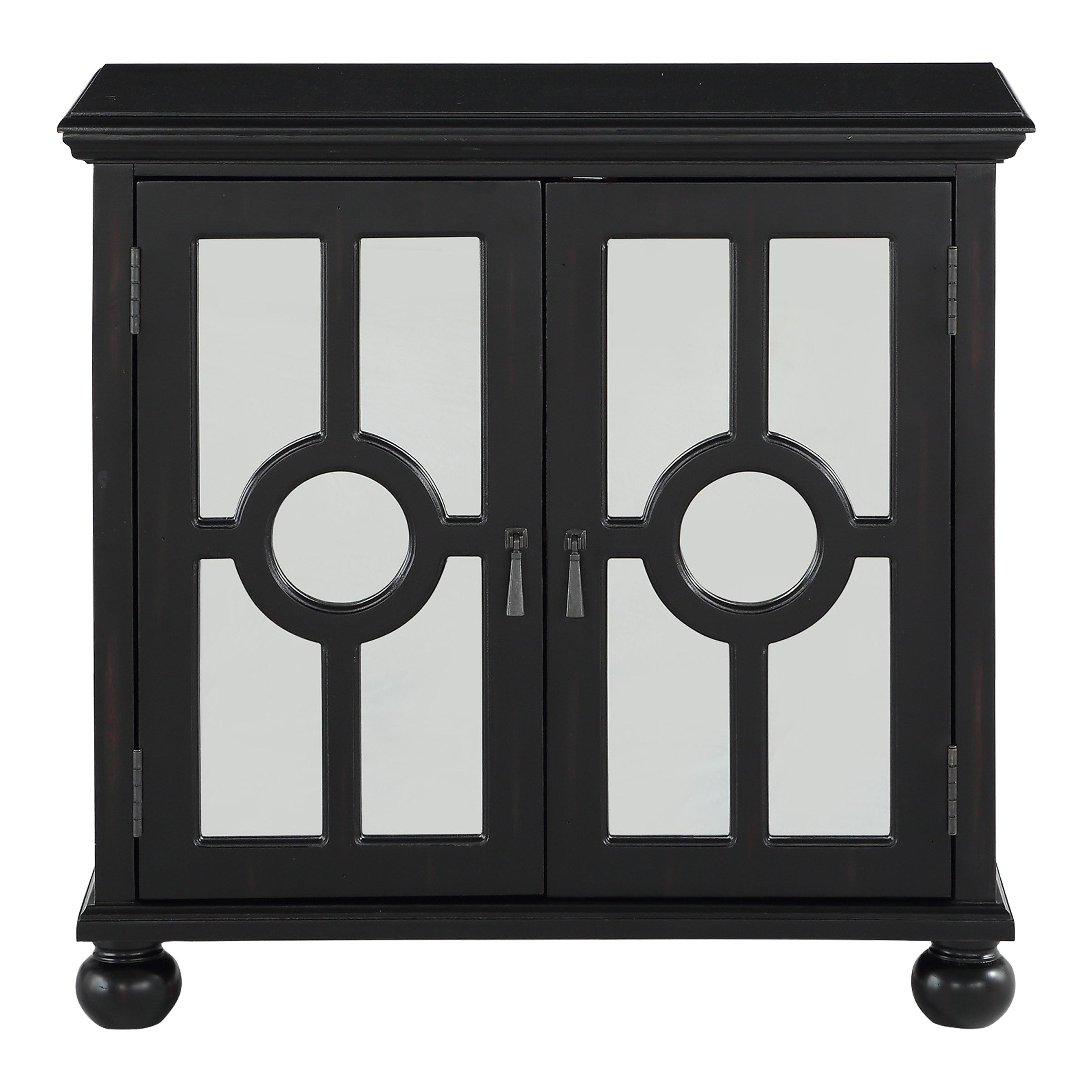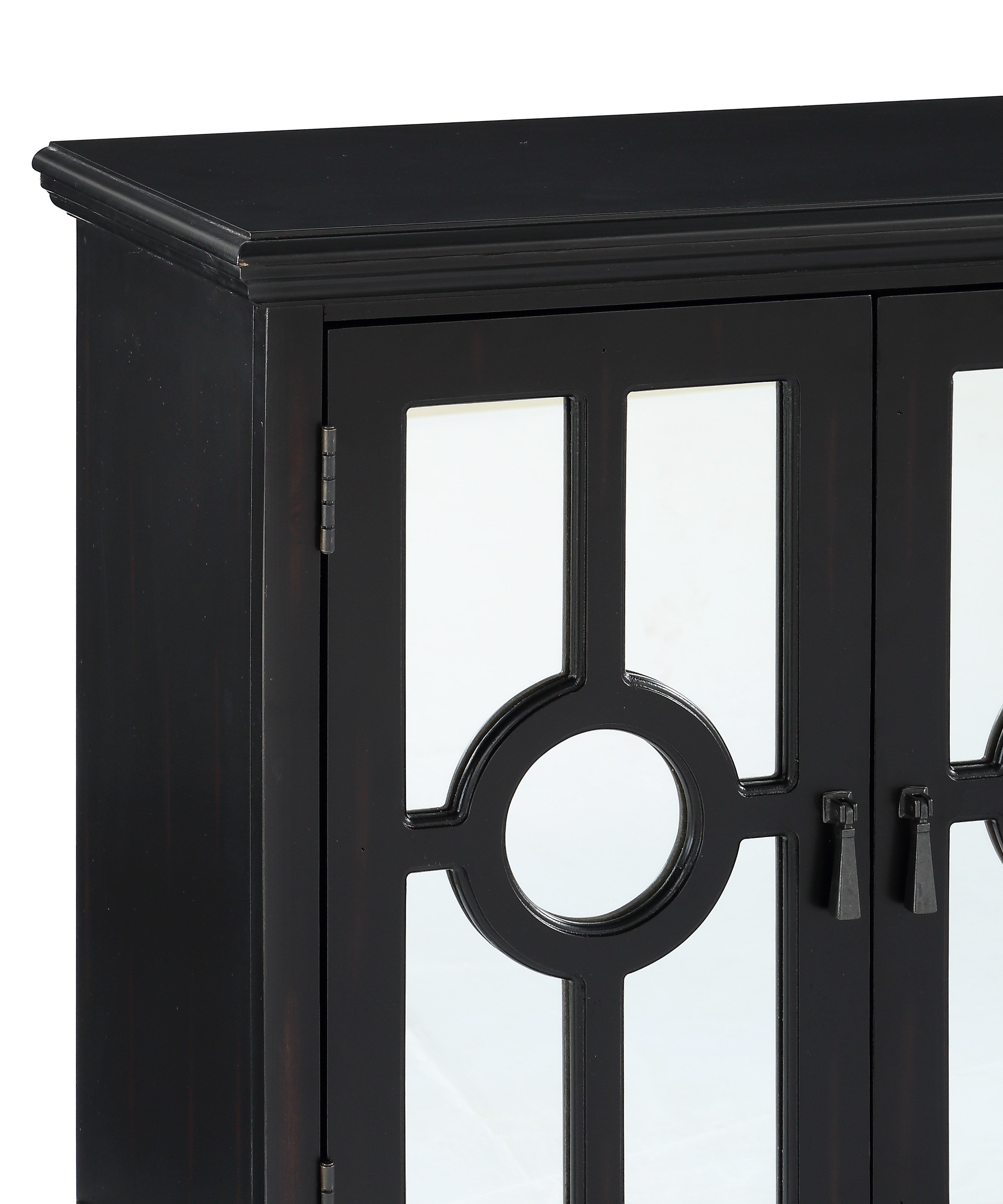The Poppy Collection provides classic accent to your home's décor while meeting your storage needs. The modern traditional design of the cabinet features behind door shelving, turned support feet, black finish, circular themed decorative mixed-media glass and wood doors, and antiqued brass hardware. Also available in aqua and gray finish.PRODUCT DIMENSIONS: Overall Dimension: 28.25" x 13.25" x 27.25"HShelf interior: 23.75" x 11.25" x 10.50" (2)Listing Includes: One Accent Chest Only.Simple Assembly Require.