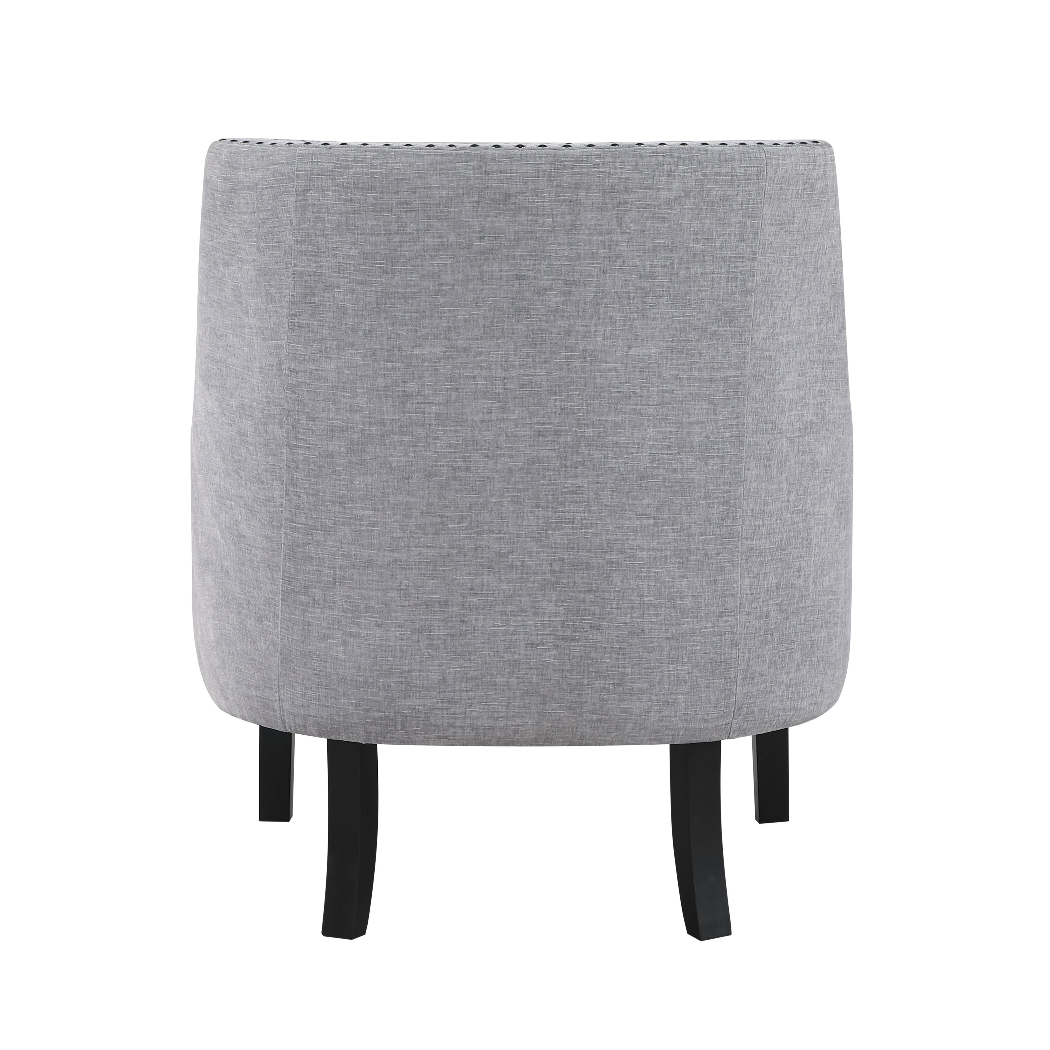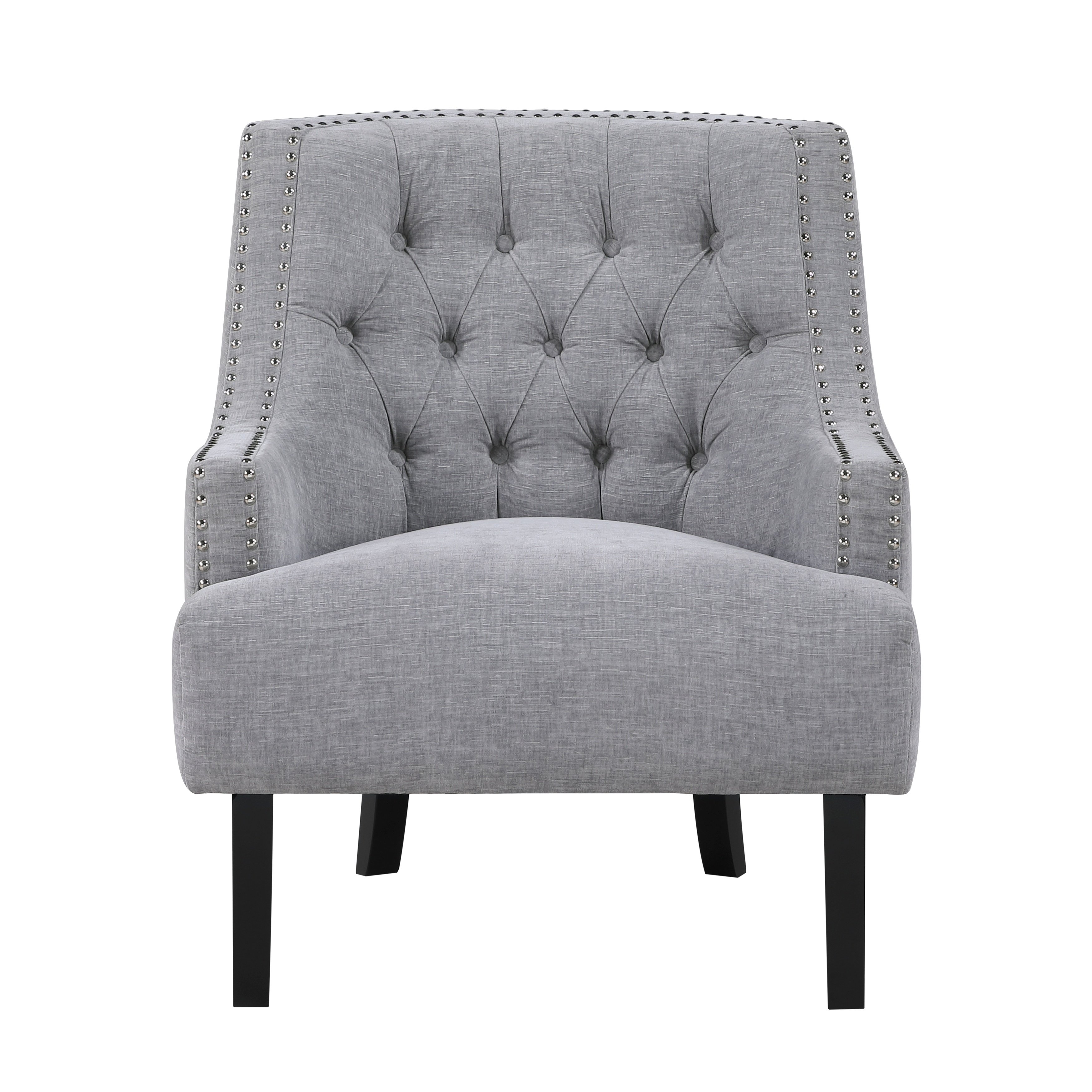 High polish nailhead accents and defines the profile of the Charisma Collection. This modern-traditional gray fabric-covered accent chair provides a stylish, yet functional addition to your home.PRODUCT DIMENSIONS: Overall Dimension: 28" x 30" x 34"HSeat Width: 22.5"Seat Depth: 22.5"Seat Height: 18"Arm height: 21.5"Listing Includes: One Accent Chair Only.Simple Assembly Require.
