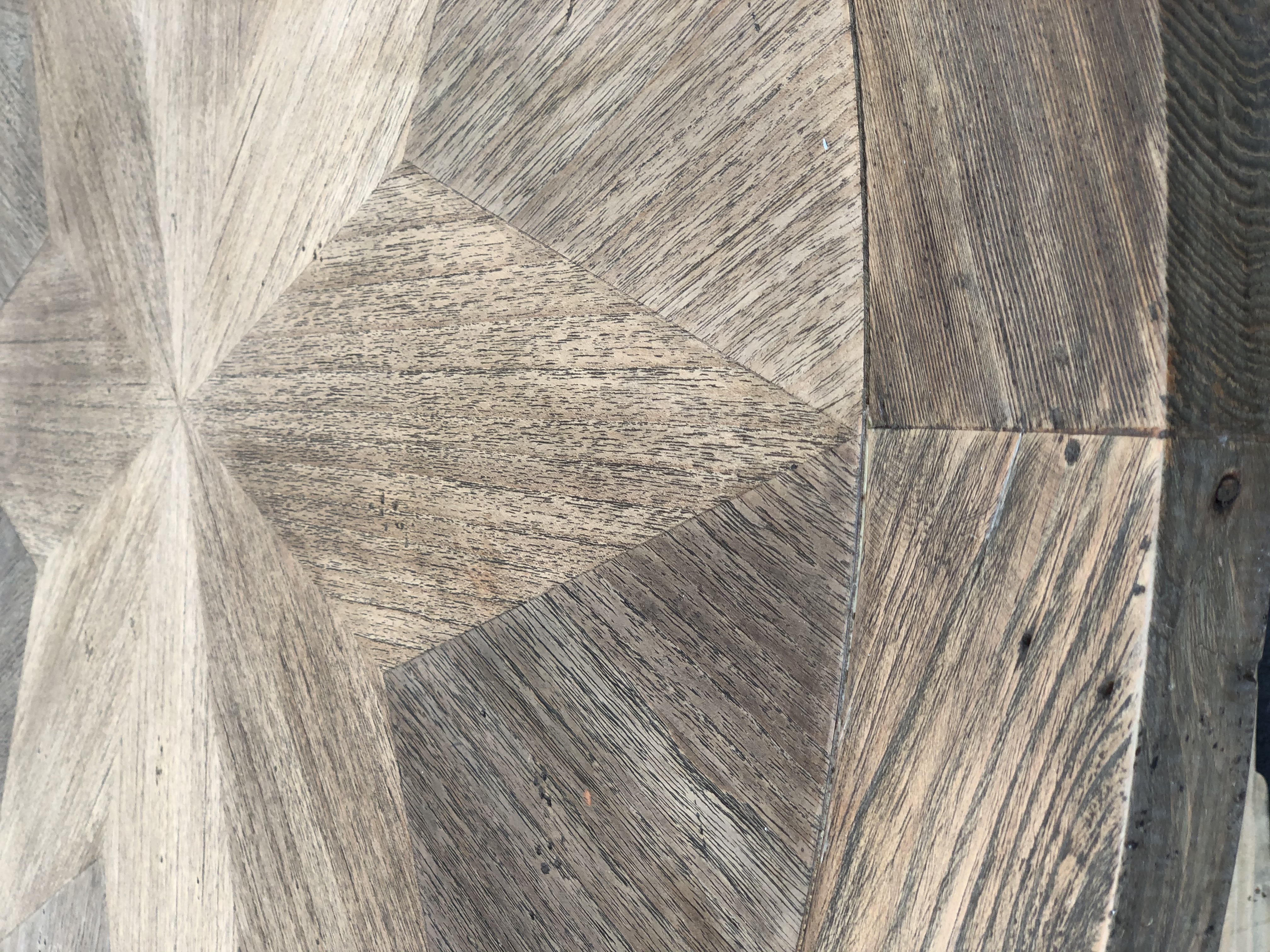 Our 48" Diameter Farmhouse Round Table is an amazing engineered table creation utilizing hand inlay. This very rare to find hand-made yet properly engineered solid wood table was proudly made possible from a lifetime of furniture manufacturing experience. The center Geometric Star design is a fine inlay of environmentally sourced Mindi wood on top of a specifically created Multiplex for a lifetime of stability. The table base and top center bands are handcrafted using reclaimed solid New Zealand Pine that is specifically hand selected, sourced, and imported for the final combined effect. The hand finishing is an open grain Farmhouse style wood finishing giving protection but maintaining the very natural effects of the reclaimed and solid woods used. Minor assembly of the top to the base allows easier placement into the home. This table pairs with many chair options as well as hutches, sideboards, consoles, kitchen islands, and many more beautiful options from the American Farmhouse Collection from Heritage, a division of AFD Home.