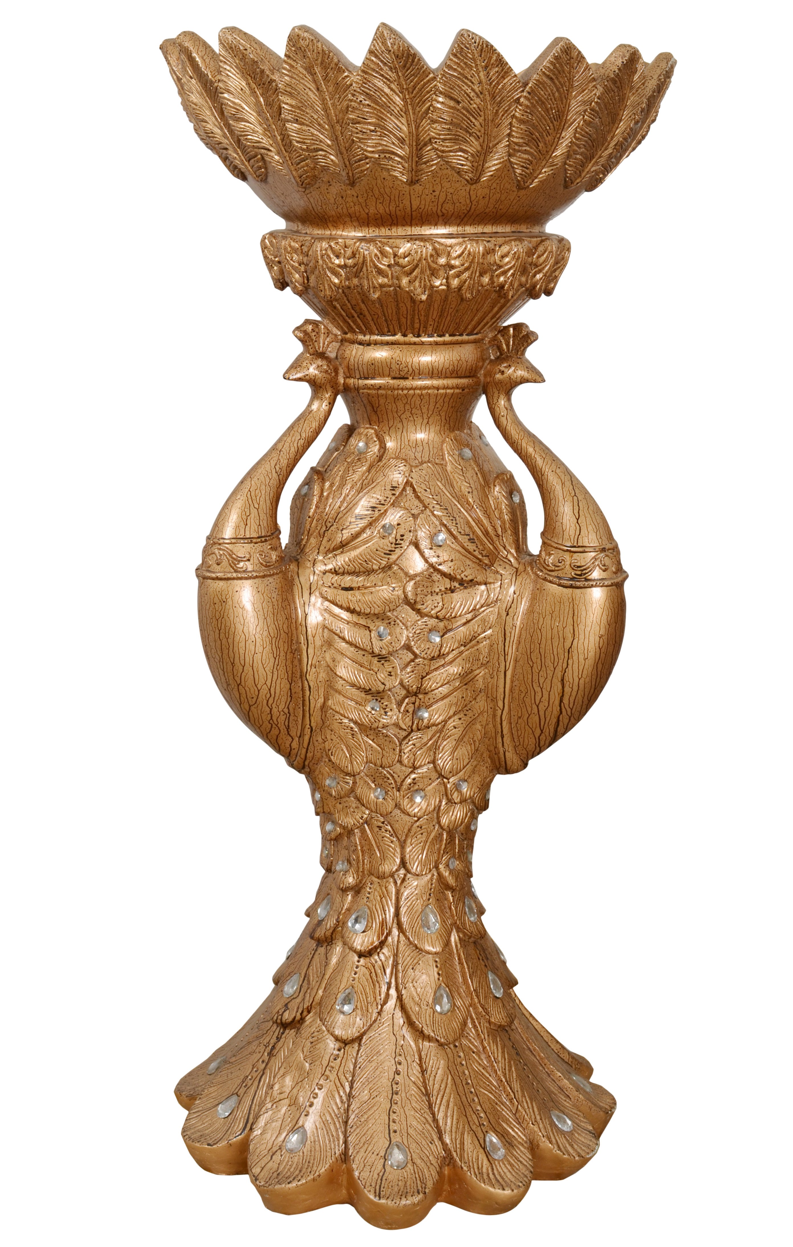 Our popular and a very unique Copper Drizzle Large Peacock Vase at 21" diameter x 47.5" tall. Featuring a rich hand applied copper drizzle finish with embedded jewels, from our Copper Drizzle Collection. The drizzled affect created uses a dark contrasting umber over a copper base and is further enhanced with a lustrous lacquer top coat. Sold separately but often ordered in pairs for balance and symmetry. This vase is also available in a smaller size consider pairing with the Copper Drizzle Peacock Vase. The vase is hand cast in a fiberglass resin which is durable and can withstand outdoor applications. The finish however is not recommended for outdoor use unless maintained with protective lacquer top coatings. The frequency of which will depend on your specific conditions.