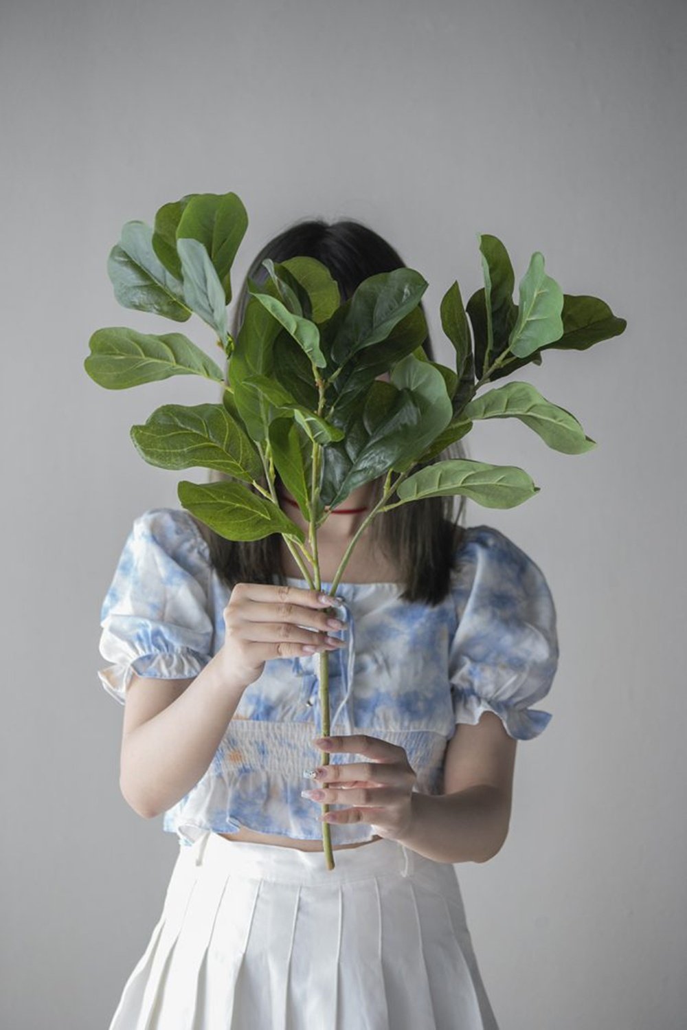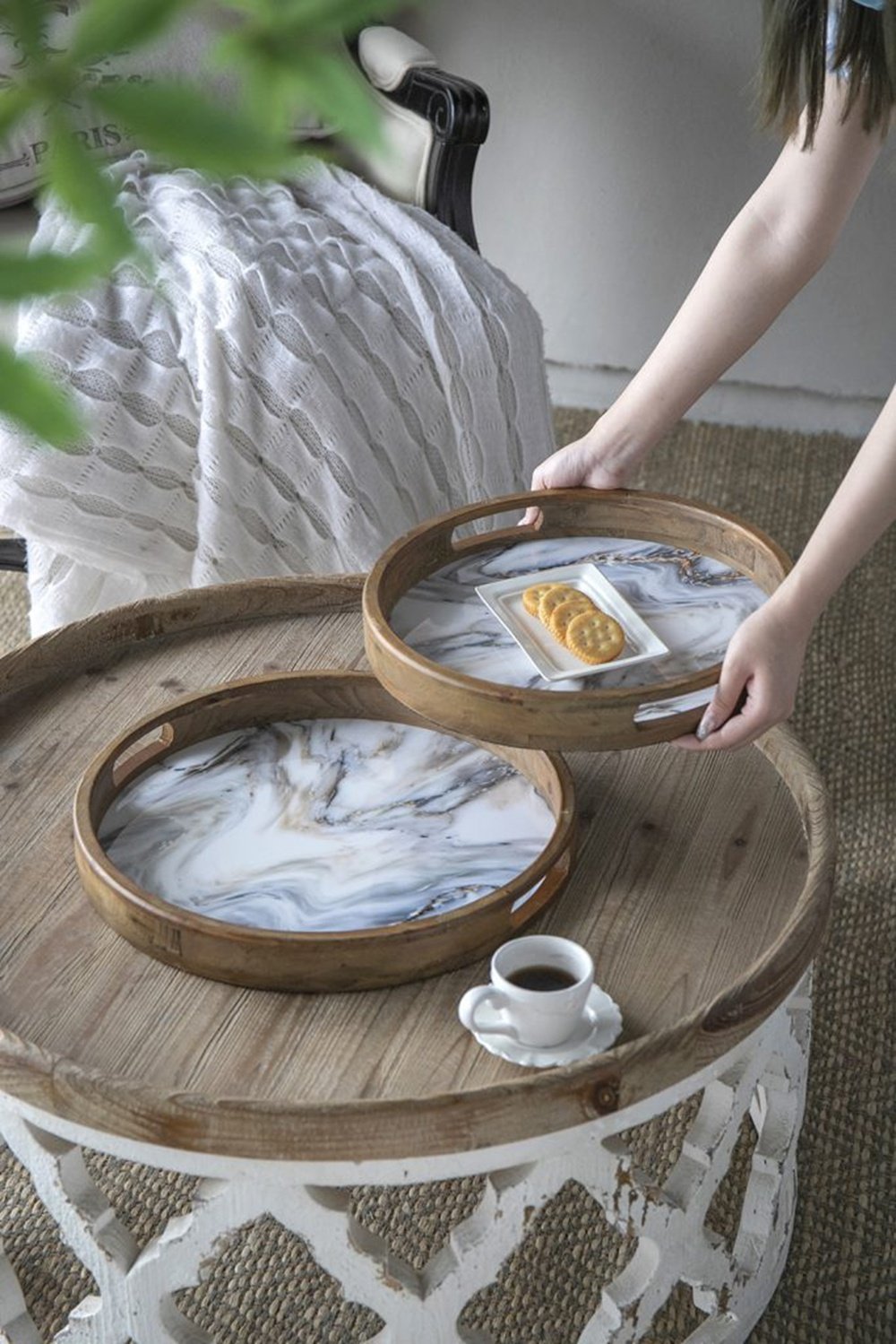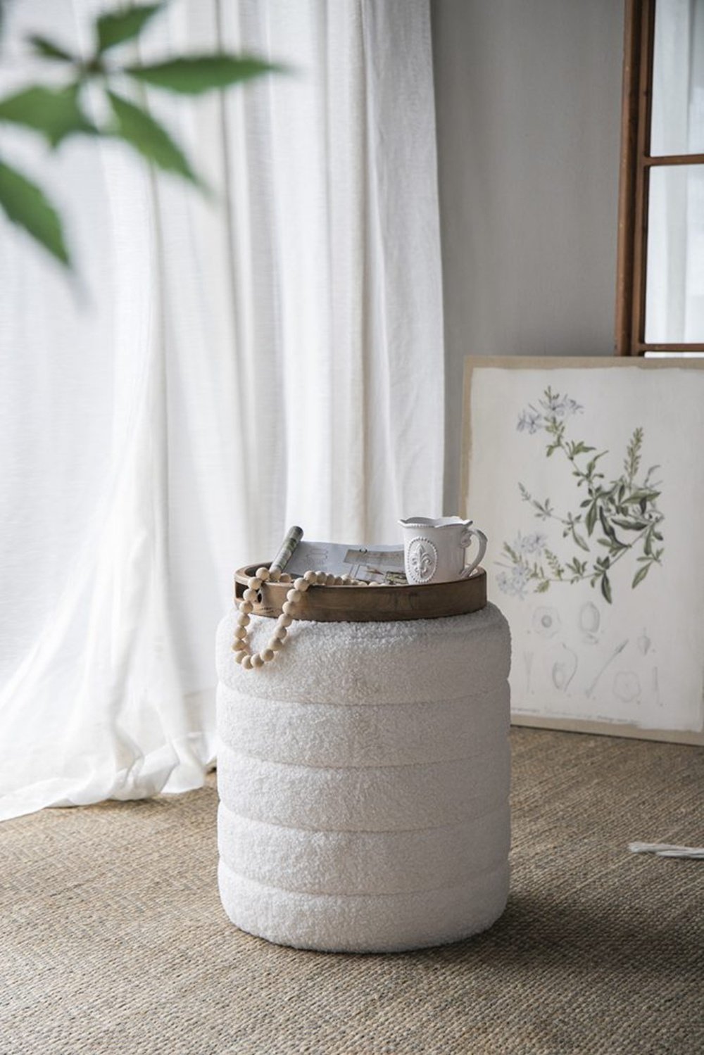 Item Include detail: 1. 20x20x23" Large Distressed White Side Table : 100% Fir Wood2. 16.5X16.5X17.5" Wood Stool : 70% Sherpa, 30% Mdf3. Set of 2 Decorative Wooden Trays L:16.5X16.5X2.5" S:14.5X14.5X2.5" : 60% Fir Wood, 40% Mdf4. D7X12" Vase : 60% Glass, 40% PU Leather5. 3 PCS 12X12X27"H Fiddle Leaf Branch : 80% Fabric, 15% Iron Wire, 5% Pe